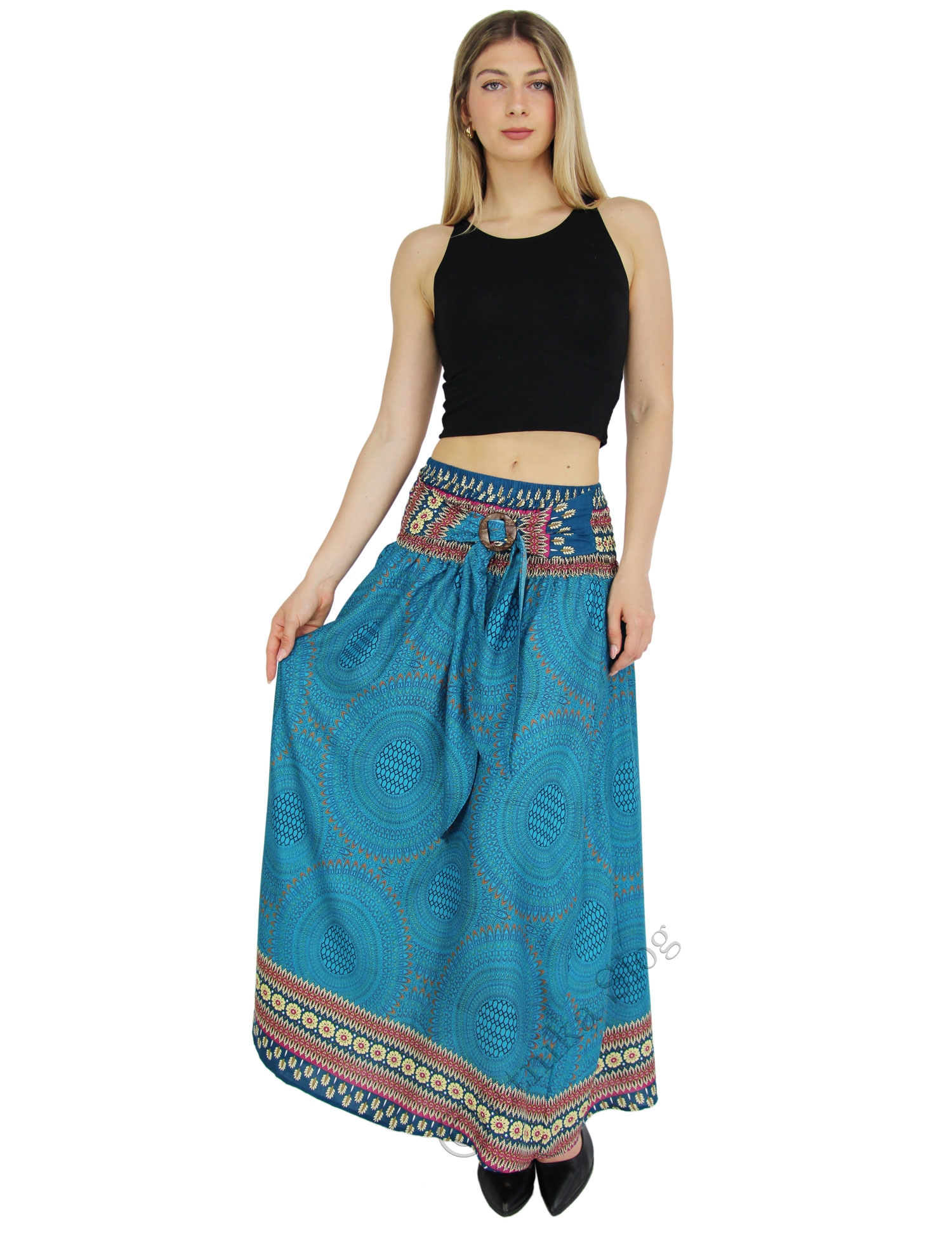 LONG SUMMER SKIRT/DRESS MADE OF VISCOSE WITH ELASTIC AT WAIST AND STRING BELT WITH COCONUT BUCKLE.