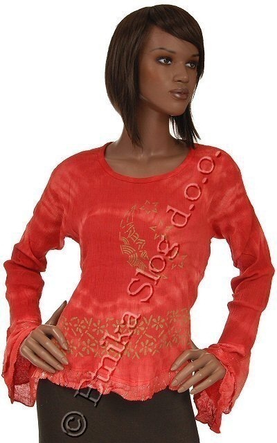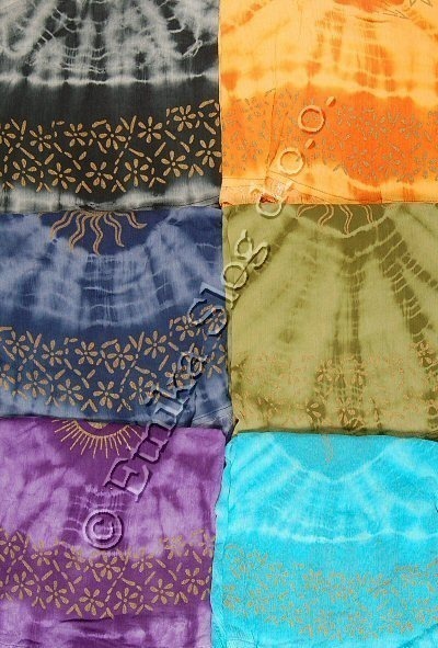 T-SHIRT IN CREPE COTTON TIE DYE, WITH LONG SLEEVE, TIERED, WITH VARIOUS DESIGNS AND PRINTED IN GOLD COLOUR. AVAILABLE IN 4 SIZES S-M-L-XL AND VARIOUS COLOURS. ASSORTED COLOURS AND SIZES.