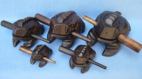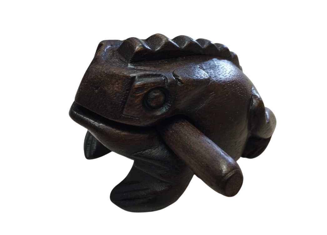 UTILIZZA IL BASTONCINO DI LEGNO PER GRATTARE DELICATAMENTE LA RANA E PRODURRE UN SUONO PROFONDO, SIMILE AL GRACIDIO DI UNA VERA RANA.