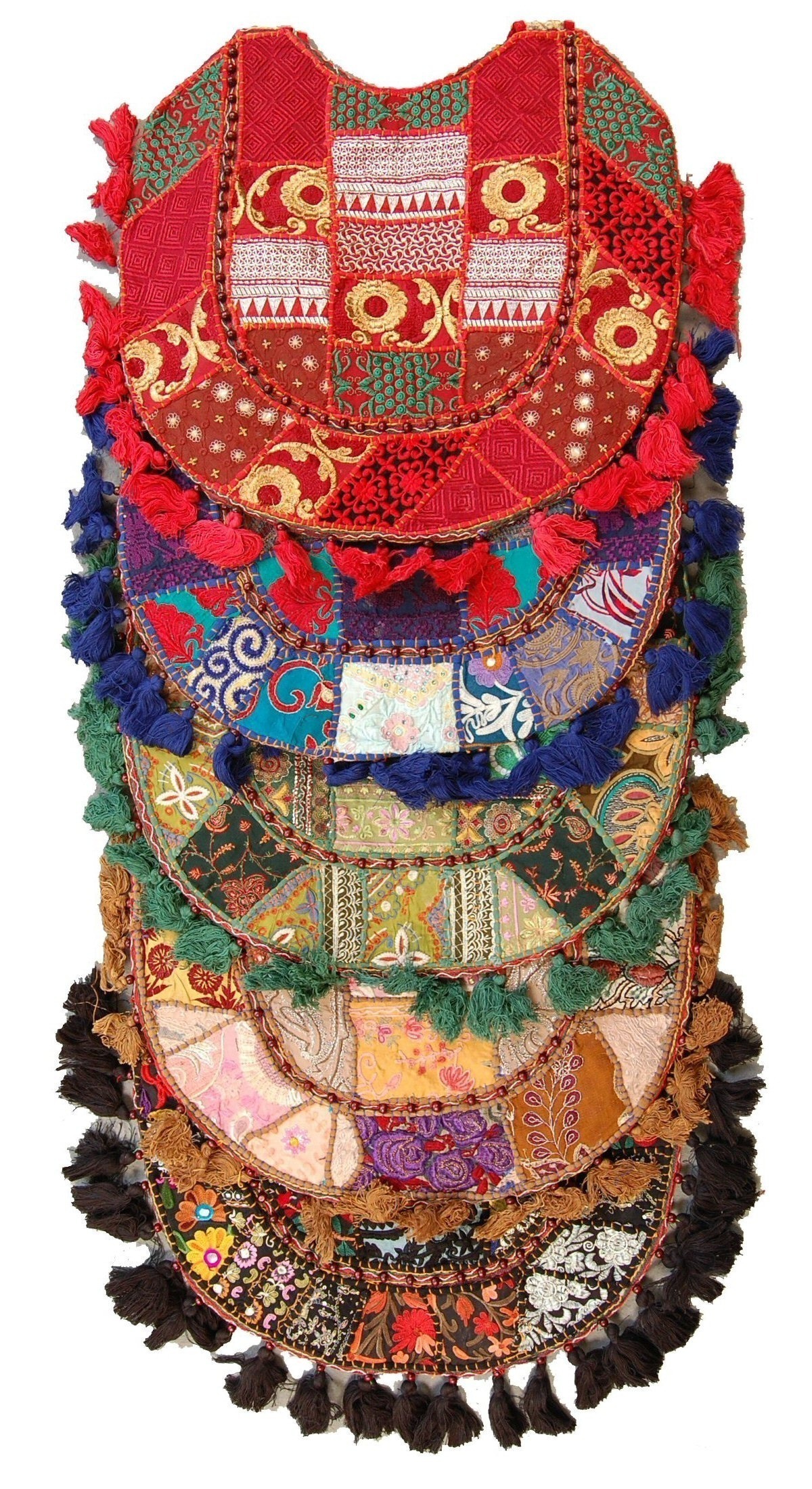BORSA DA SPALLA ROTONDA IN COTONE PATCHWORK, RICAMI SARI E FIOCCHETTI.