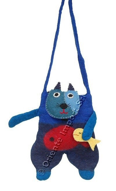 BORSA IN LANA COTTA, A TRACOLLA GRANDE, A FORMA DI GATTO CON PESCE.
