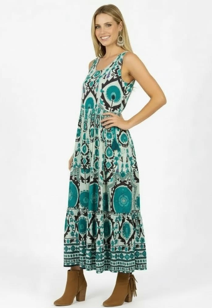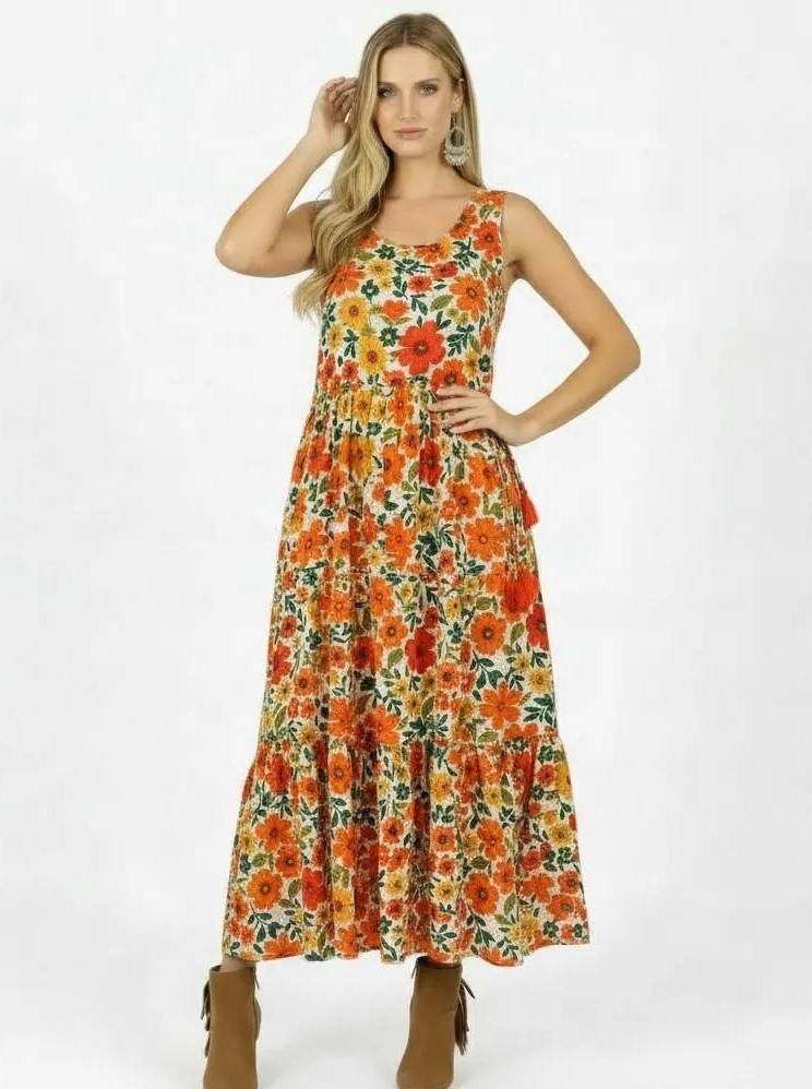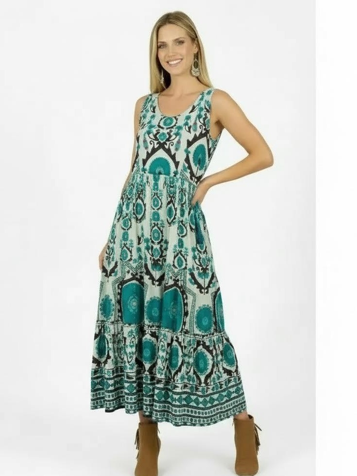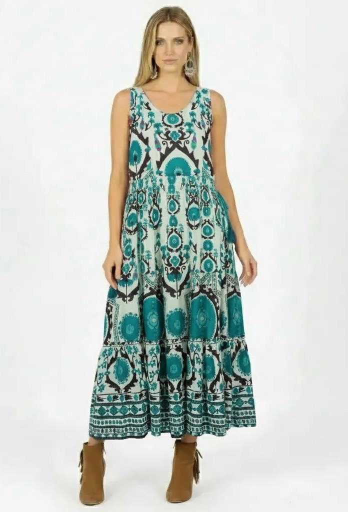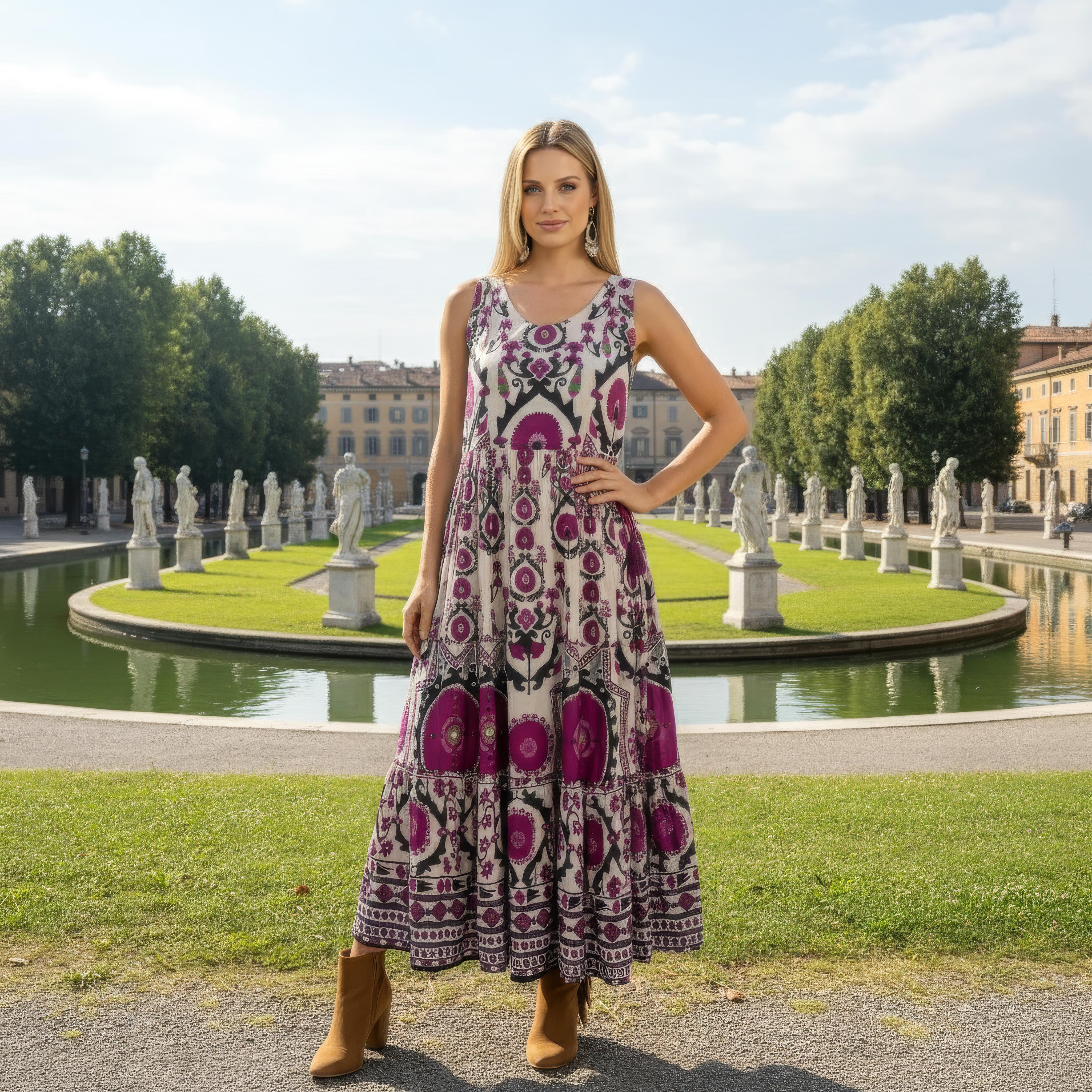 VESTITO LUNGO INDIANO IN FIOCCO DI COTONE MORBIDO E LEGGERO STAMPATO.