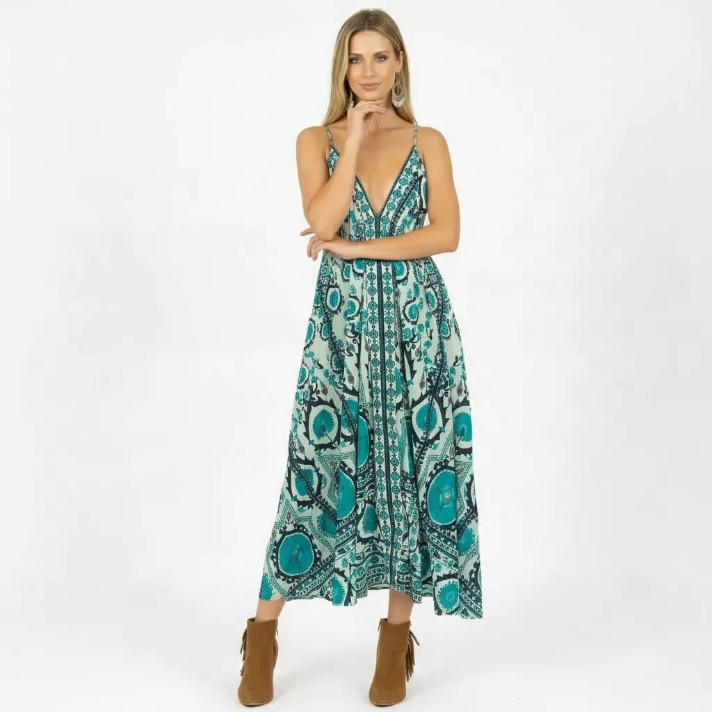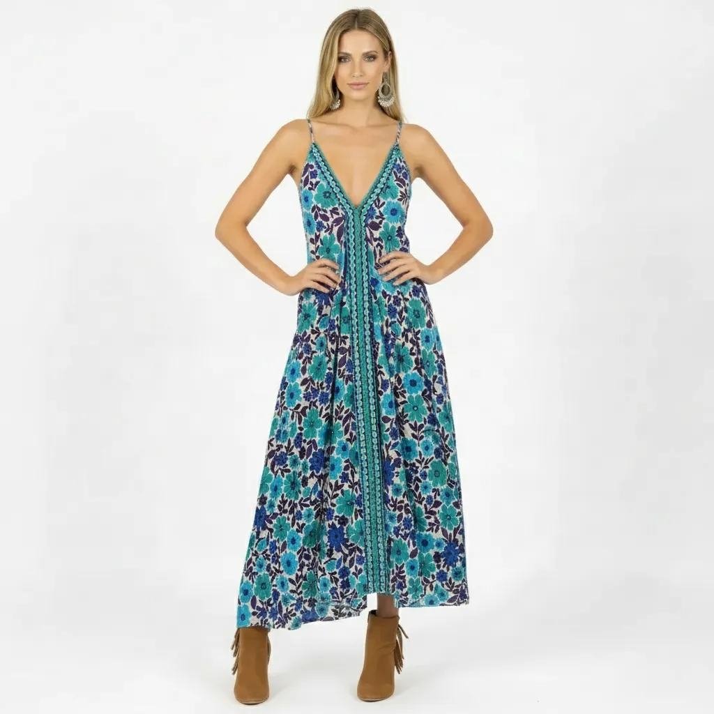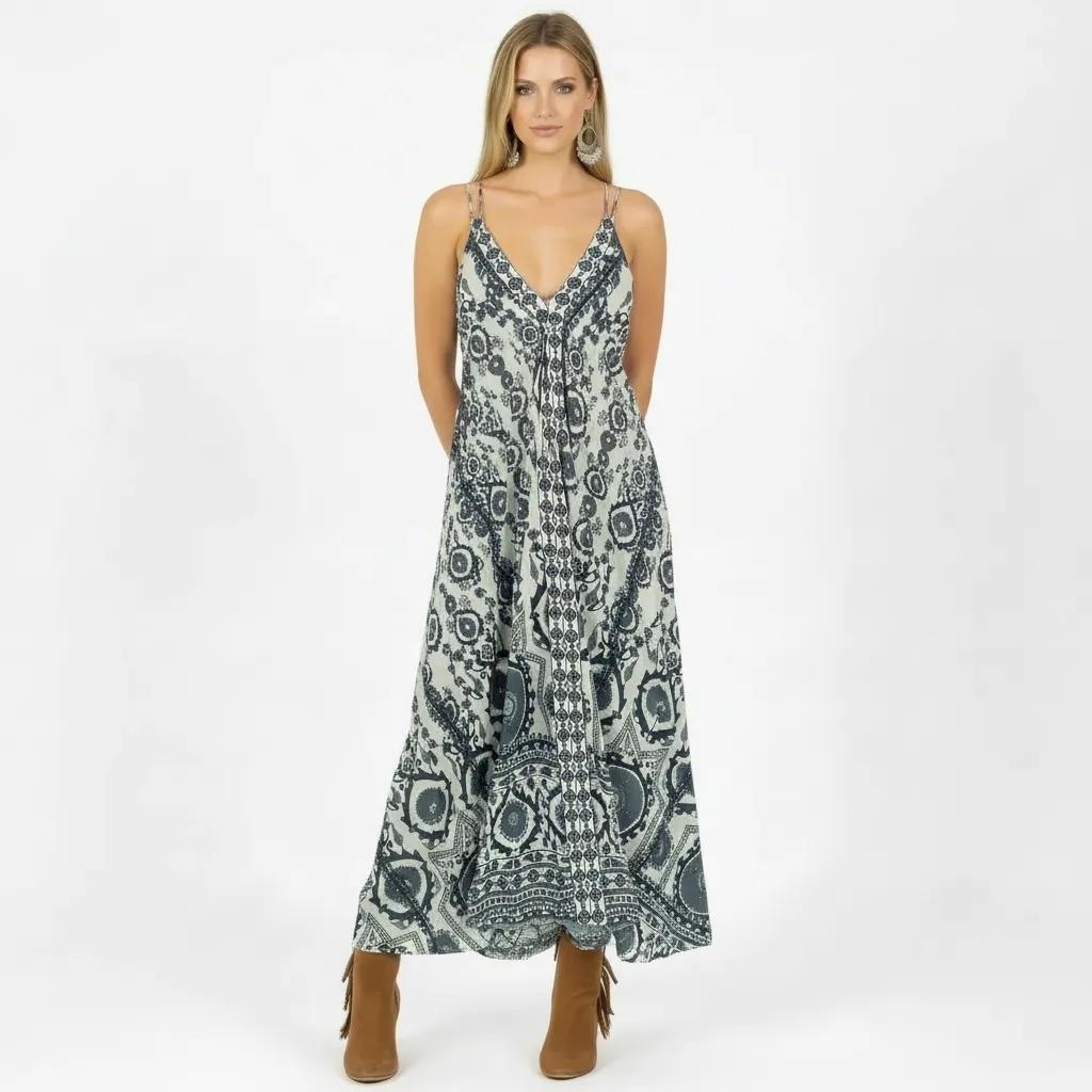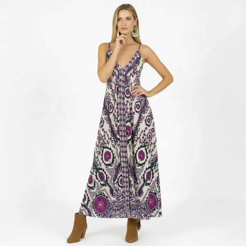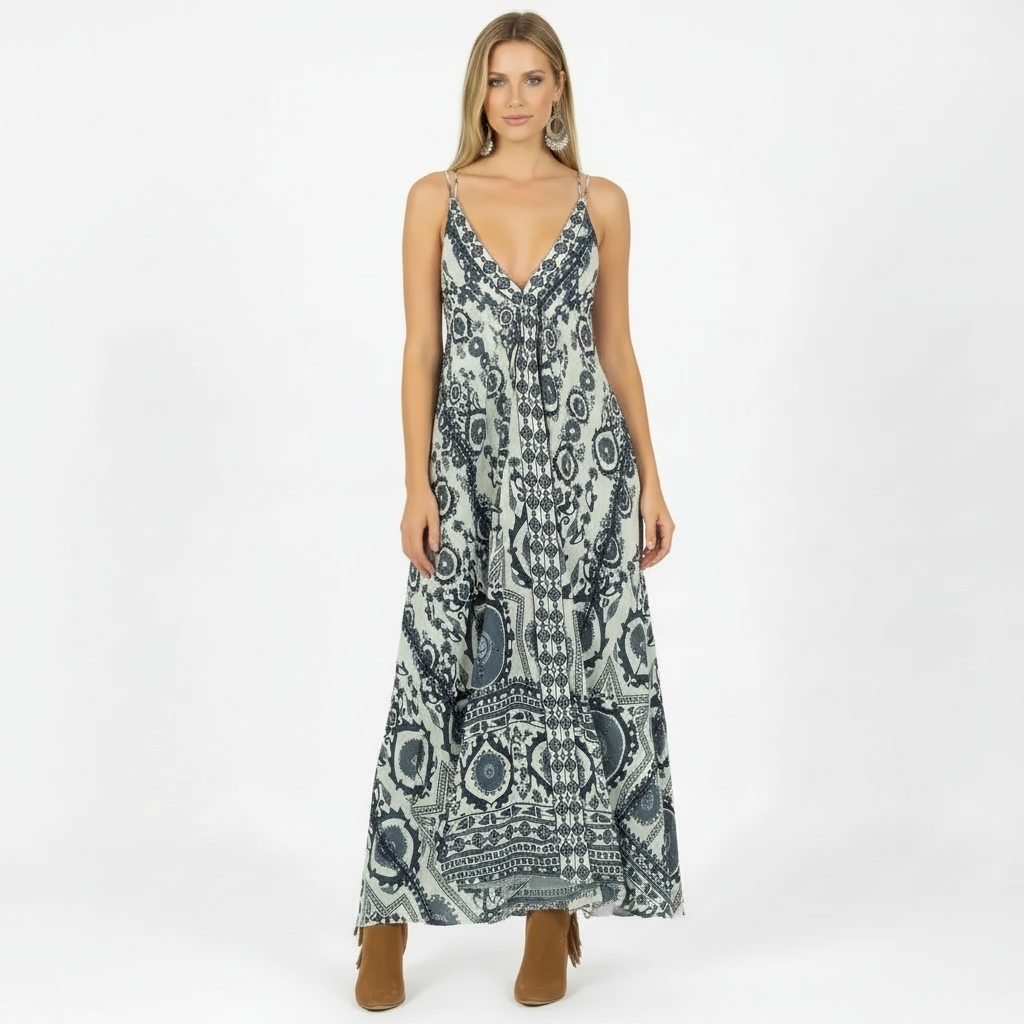 VESTITO LUNGO INDIANO IN FIOCCO DI COTONE MORBIDO E LEGGERO STAMPATO.