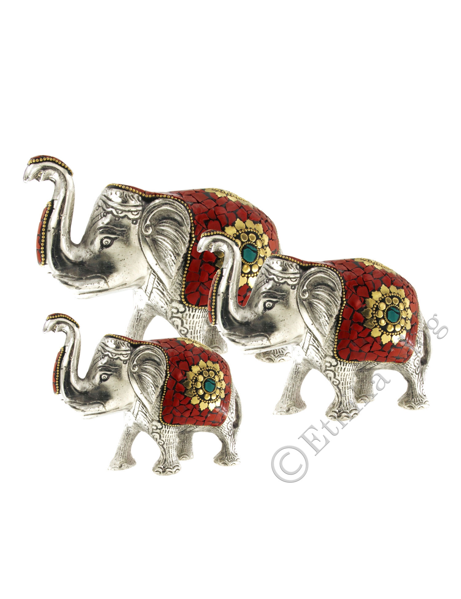 SET 3 ELEFANTI IN METALLO BIANCO CON APPLICAZIONI A MOSAICO.