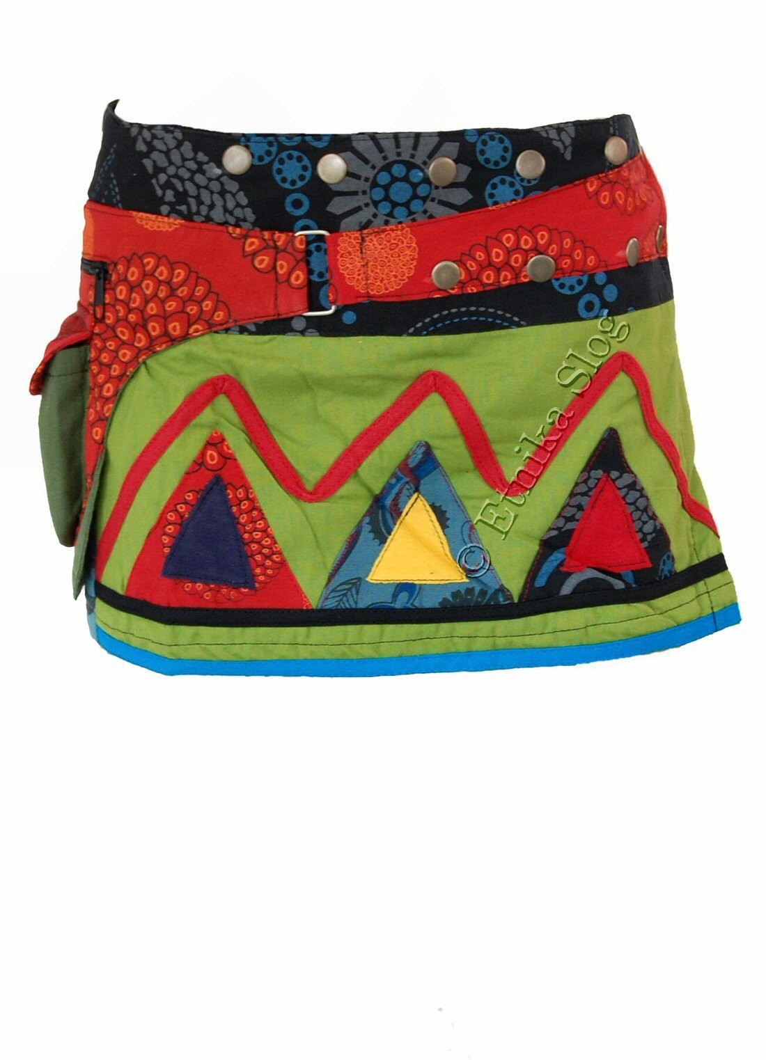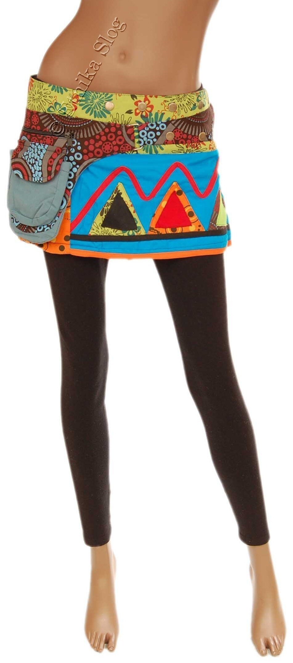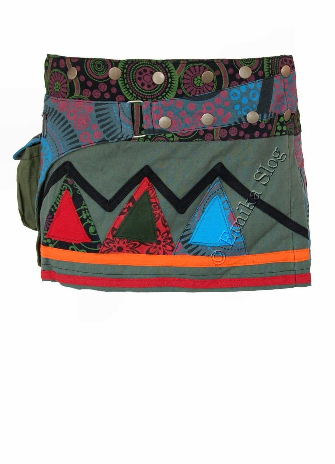 KRATKO KRILO IZ BOMBAŽA, Z RAZLIČNIMI VZORCI IN VELIKIM ŽEPOM PRI STRANI. ZAPIRANJE Z GUMBI.
