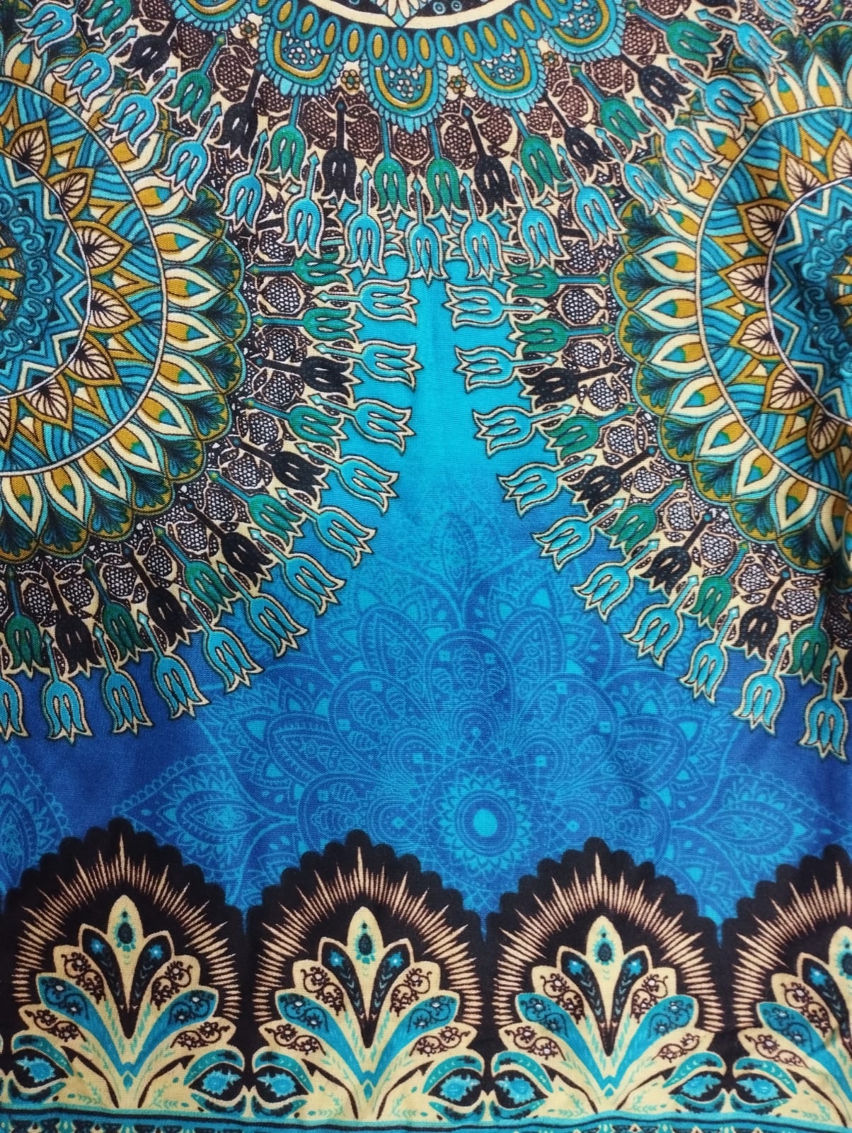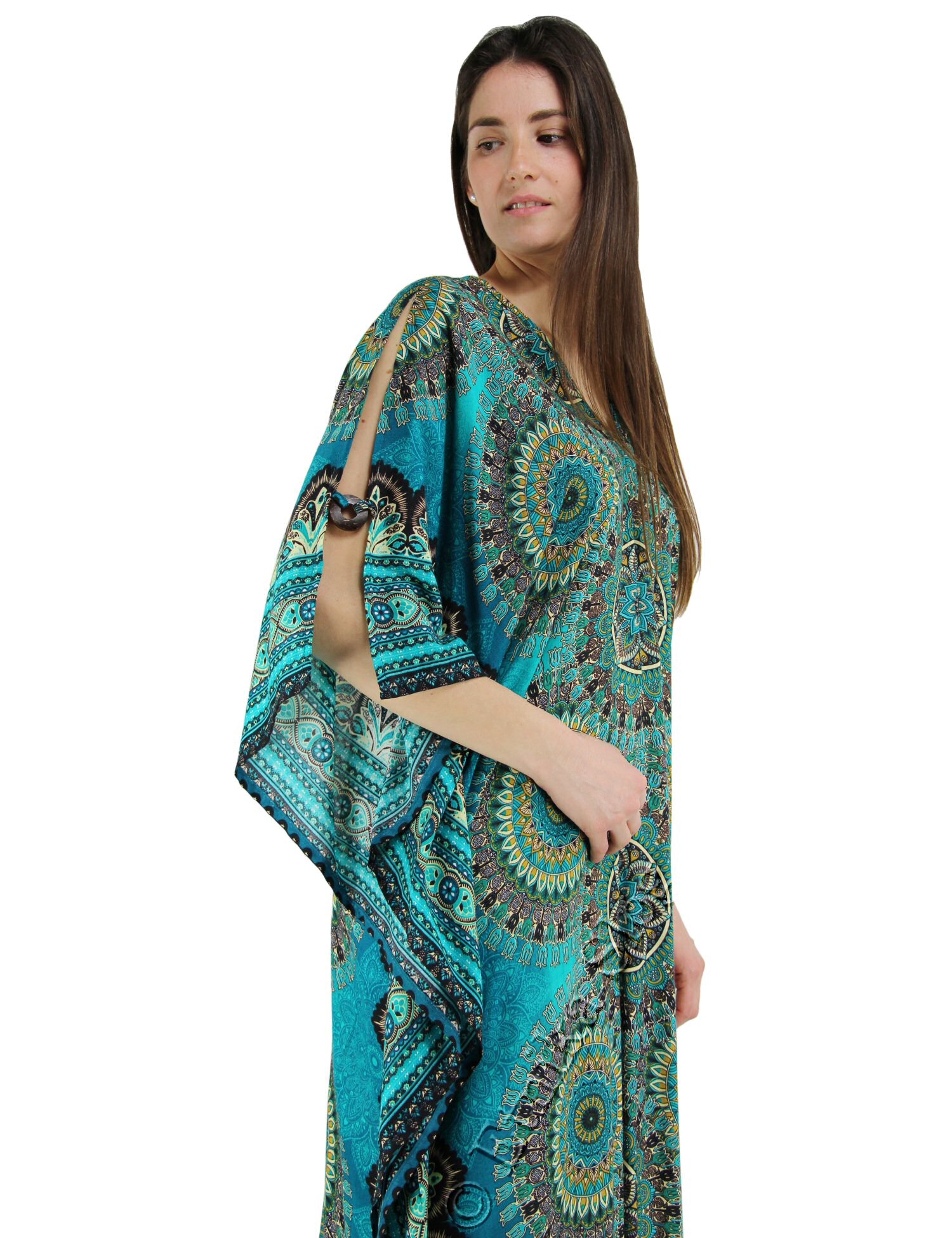 DOLGA OBLEKA - KAFTAN IZ VISKOZE, Z GUMBI IZ KOKOSA NA RAMENIH.